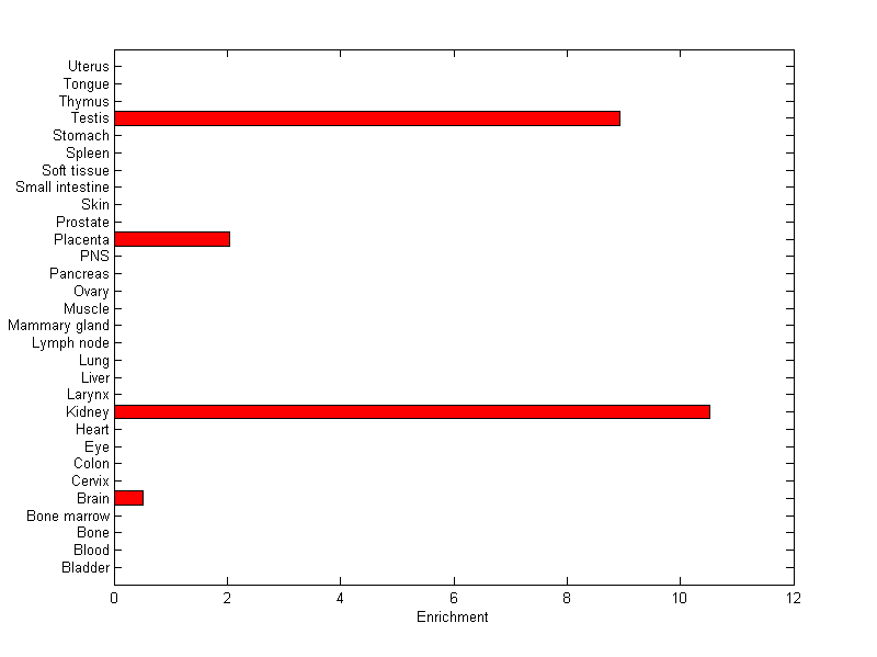 About the profile: The expression level is normalized with tissue-library size. Each value for a gene in a tissue is a ratio of observed ESTs to the expected one in this tissue. The expected number of ESTs is the product of total ESTs of the gene and the fraction of total ESTs in the tissue among all ESTs in 30 tissues. Summary: This gene is preferentially expressed in [kidney, testis] Download: |