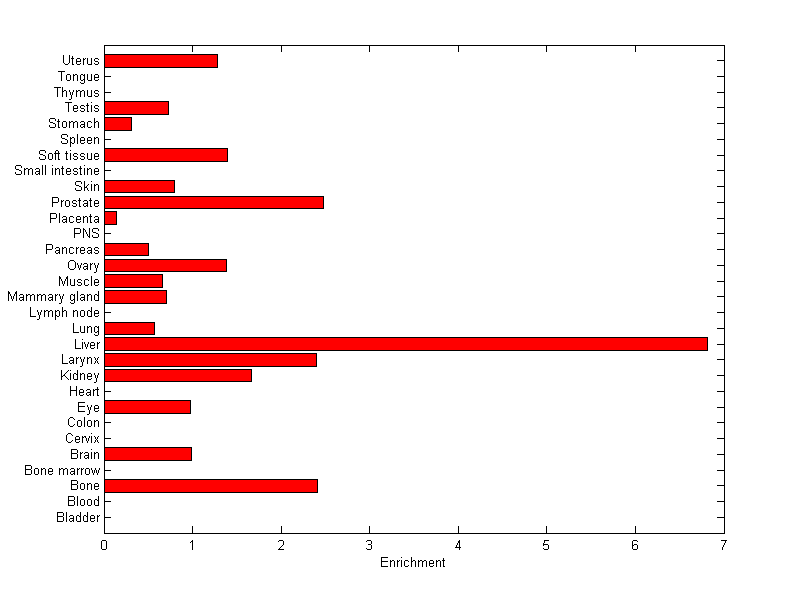 The expression level is normalized with tissue-library size. Each value for a gene in a tissue is a ratio of observed ESTs to the expected one in this tissue. The expected number of ESTs is the product of total ESTs of the gene and the fraction of total ESTs in the tissue among all ESTs in 30 tissues.