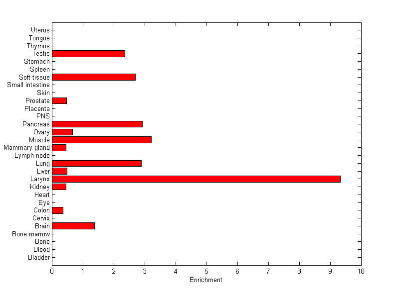 The expression level is normalized with tissue-library size. Each value for a gene in a tissue is a ratio of observed ESTs to the expected one in this tissue. The expected number of ESTs is the product of total ESTs of the gene and the fraction of total ESTs in the tissue among all ESTs in 30 tissues.