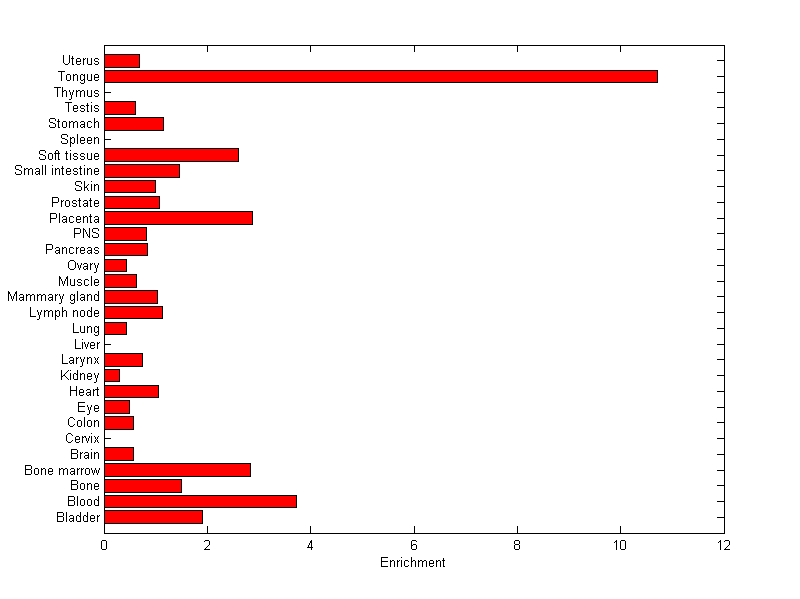 The expression level is normalized with tissue-library size. Each value for a gene in a tissue is a ratio of observed ESTs to the expected one in this tissue. The expected number of ESTs is the product of total ESTs of the gene and the fraction of total ESTs in the tissue among all ESTs in 30 tissues.