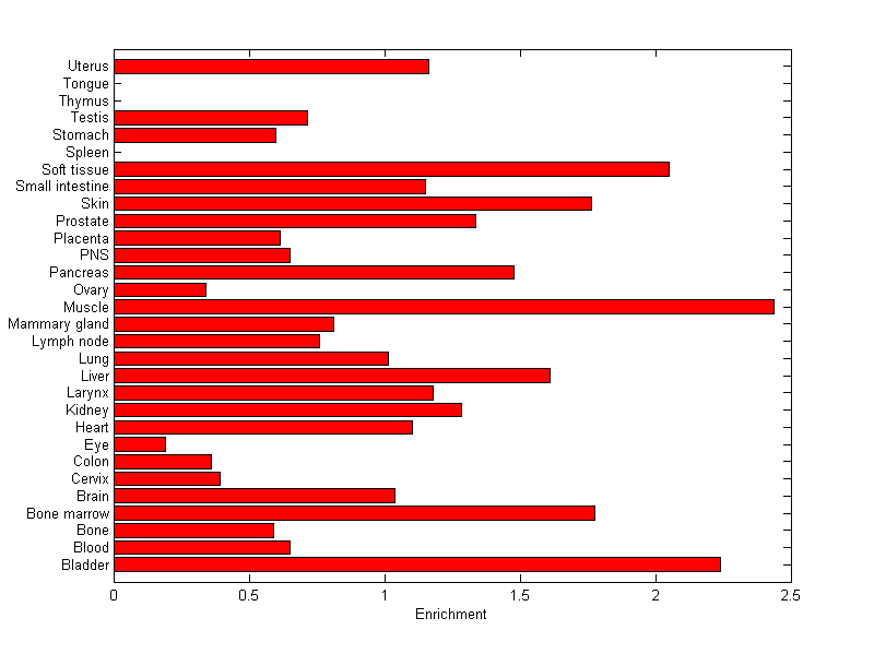 The expression level is normalized with tissue-library size. Each value for a gene in a tissue is a ratio of observed ESTs to the expected one in this tissue. The expected number of ESTs is the product of total ESTs of the gene and the fraction of total ESTs in the tissue among all ESTs in 30 tissues.