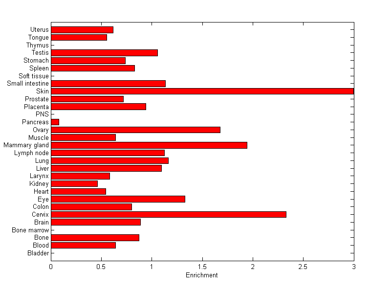 The expression level is normalized with tissue-library size. Each value for a gene in a tissue is a ratio of observed ESTs to the expected one in this tissue. The expected number of ESTs is the product of total ESTs of the gene and the fraction of total ESTs in the tissue among all ESTs in 30 tissues.