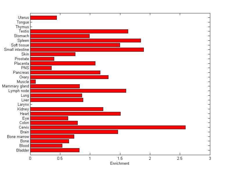 The expression level is normalized with tissue-library size. Each value for a gene in a tissue is a ratio of observed ESTs to the expected one in this tissue. The expected number of ESTs is the product of total ESTs of the gene and the fraction of total ESTs in the tissue among all ESTs in 30 tissues.