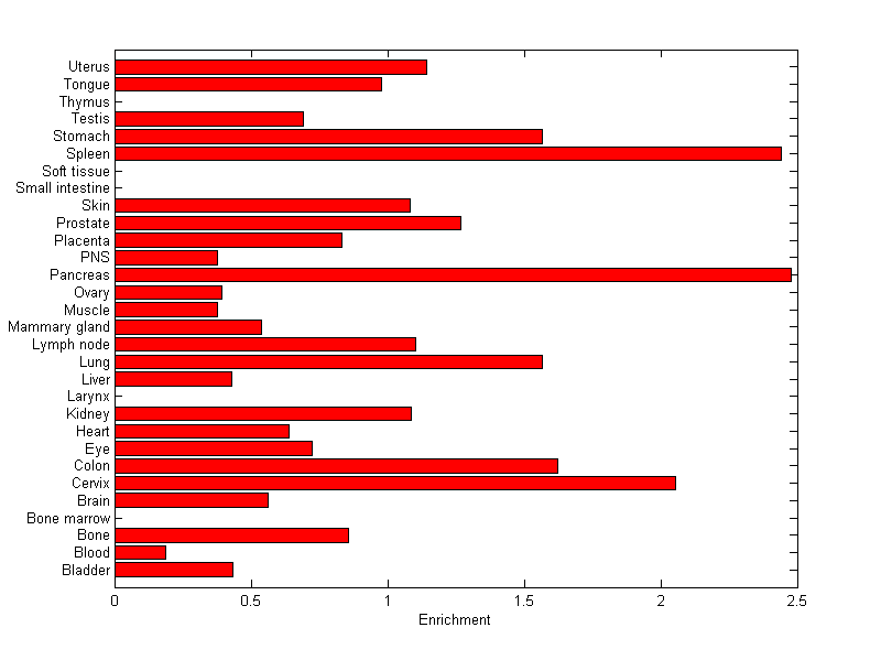 The expression level is normalized with tissue-library size. Each value for a gene in a tissue is a ratio of observed ESTs to the expected one in this tissue. The expected number of ESTs is the product of total ESTs of the gene and the fraction of total ESTs in the tissue among all ESTs in 30 tissues.