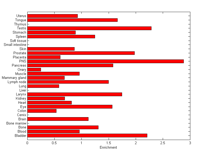 The expression level is normalized with tissue-library size. Each value for a gene in a tissue is a ratio of observed ESTs to the expected one in this tissue. The expected number of ESTs is the product of total ESTs of the gene and the fraction of total ESTs in the tissue among all ESTs in 30 tissues.