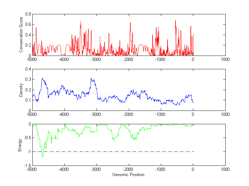 About the profiles: The conservation profile (red curve) is about conservation scores of the promoter sequences. Conservation was determined from an eight-way alignment of human, chimpanzee, dog, mouse, rat, chicken, zebrafish and fugu sequences. The conservation was quantified by a conservation score between 0 and 1, with 1 as highest conservation. The conservation score was obtained from UCSC genome databases. The density profile (blue curve) is about density of all TF binding sites. The energy profile (green curve) is about energy for module detection based on TF interaction. The positions with energy less than -1 indicate the existence of CRMs. Download: Conservation profileDensity profile Energy profile CRM summary |