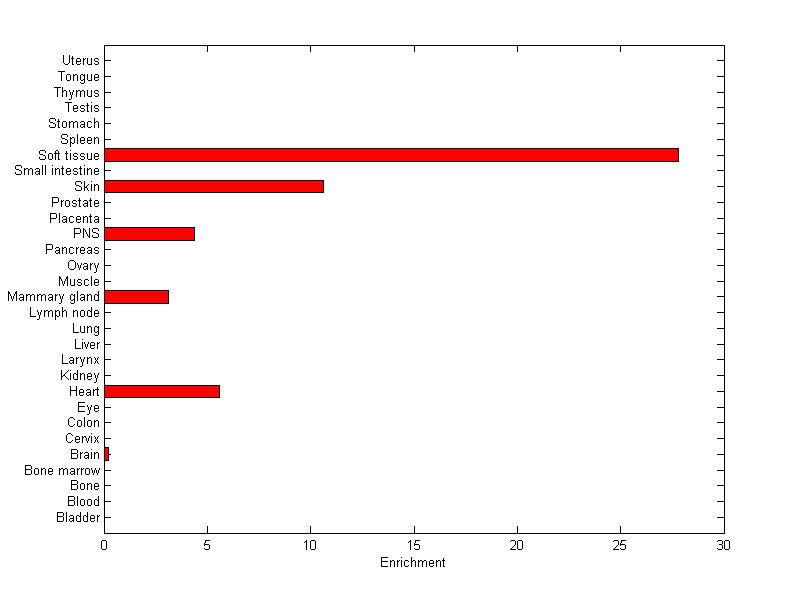 About the profile: The expression level is normalized with tissue-library size. Each value for a gene in a tissue is a ratio of observed ESTs to the expected one in this tissue. The expected number of ESTs is the product of total ESTs of the gene and the fraction of total ESTs in the tissue among all ESTs in 30 tissues. Summary: This gene is preferentially expressed in [skin, soft_tissue] Download: |