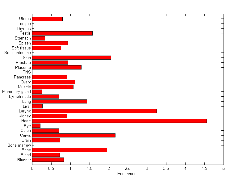The expression level is normalized with tissue-library size. Each value for a gene in a tissue is a ratio of observed ESTs to the expected one in this tissue. The expected number of ESTs is the product of total ESTs of the gene and the fraction of total ESTs in the tissue among all ESTs in 30 tissues.
