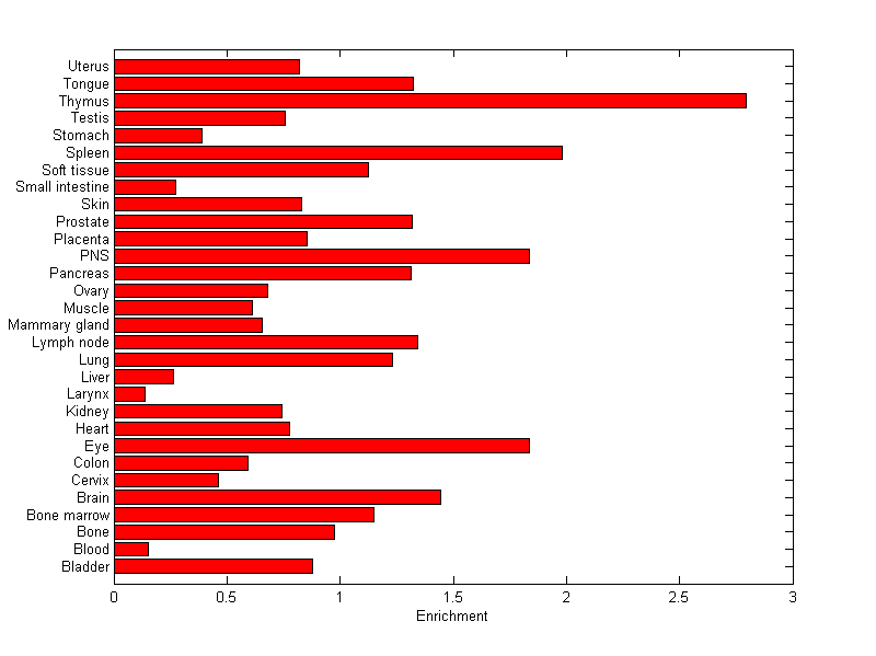 The expression level is normalized with tissue-library size. Each value for a gene in a tissue is a ratio of observed ESTs to the expected one in this tissue. The expected number of ESTs is the product of total ESTs of the gene and the fraction of total ESTs in the tissue among all ESTs in 30 tissues.