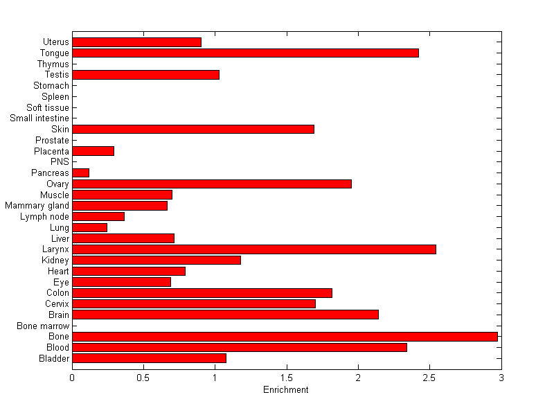The expression level is normalized with tissue-library size. Each value for a gene in a tissue is a ratio of observed ESTs to the expected one in this tissue. The expected number of ESTs is the product of total ESTs of the gene and the fraction of total ESTs in the tissue among all ESTs in 30 tissues.