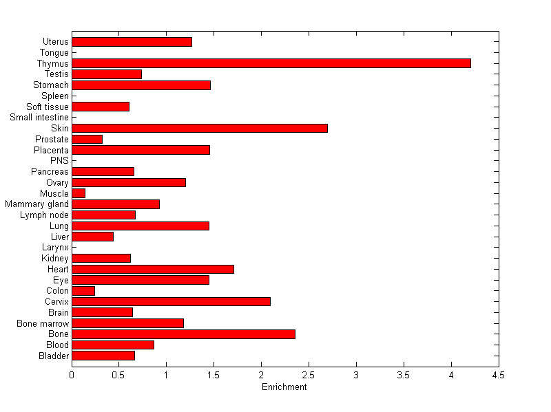 The expression level is normalized with tissue-library size. Each value for a gene in a tissue is a ratio of observed ESTs to the expected one in this tissue. The expected number of ESTs is the product of total ESTs of the gene and the fraction of total ESTs in the tissue among all ESTs in 30 tissues.