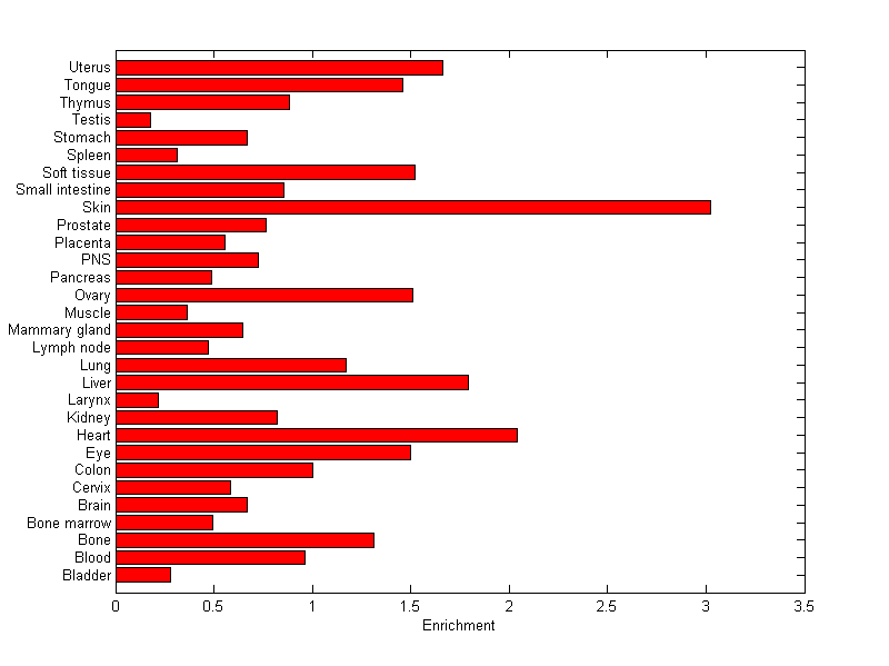 The expression level is normalized with tissue-library size. Each value for a gene in a tissue is a ratio of observed ESTs to the expected one in this tissue. The expected number of ESTs is the product of total ESTs of the gene and the fraction of total ESTs in the tissue among all ESTs in 30 tissues.