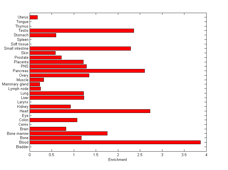 The expression level is normalized with tissue-library size. Each value for a gene in a tissue is a ratio of observed ESTs to the expected one in this tissue. The expected number of ESTs is the product of total ESTs of the gene and the fraction of total ESTs in the tissue among all ESTs in 30 tissues.