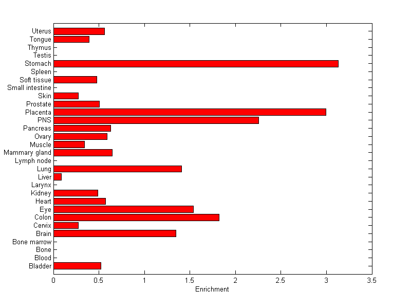 The expression level is normalized with tissue-library size. Each value for a gene in a tissue is a ratio of observed ESTs to the expected one in this tissue. The expected number of ESTs is the product of total ESTs of the gene and the fraction of total ESTs in the tissue among all ESTs in 30 tissues.