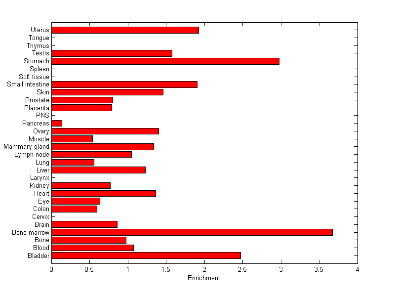 The expression level is normalized with tissue-library size. Each value for a gene in a tissue is a ratio of observed ESTs to the expected one in this tissue. The expected number of ESTs is the product of total ESTs of the gene and the fraction of total ESTs in the tissue among all ESTs in 30 tissues.
