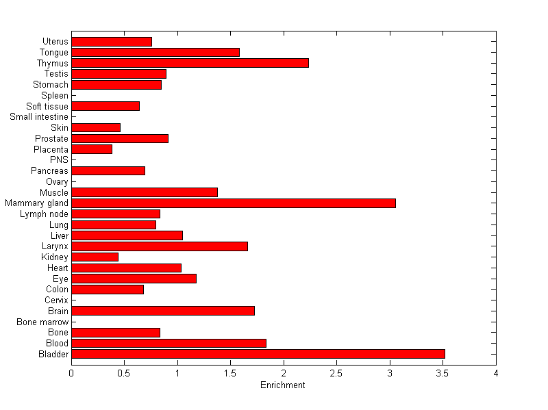 The expression level is normalized with tissue-library size. Each value for a gene in a tissue is a ratio of observed ESTs to the expected one in this tissue. The expected number of ESTs is the product of total ESTs of the gene and the fraction of total ESTs in the tissue among all ESTs in 30 tissues.