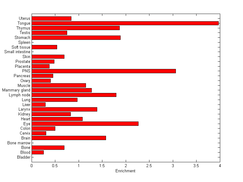 The expression level is normalized with tissue-library size. Each value for a gene in a tissue is a ratio of observed ESTs to the expected one in this tissue. The expected number of ESTs is the product of total ESTs of the gene and the fraction of total ESTs in the tissue among all ESTs in 30 tissues.