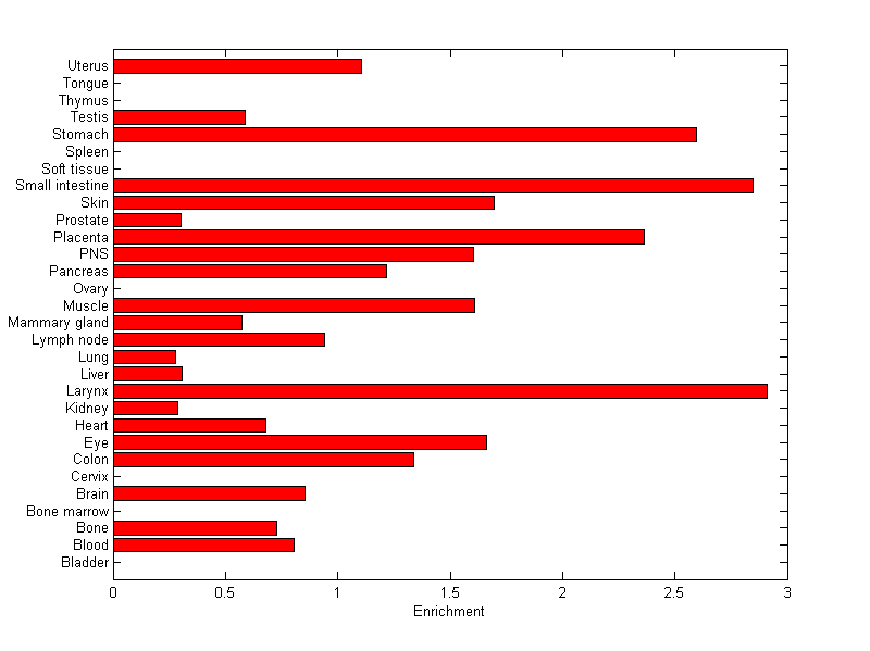 The expression level is normalized with tissue-library size. Each value for a gene in a tissue is a ratio of observed ESTs to the expected one in this tissue. The expected number of ESTs is the product of total ESTs of the gene and the fraction of total ESTs in the tissue among all ESTs in 30 tissues.