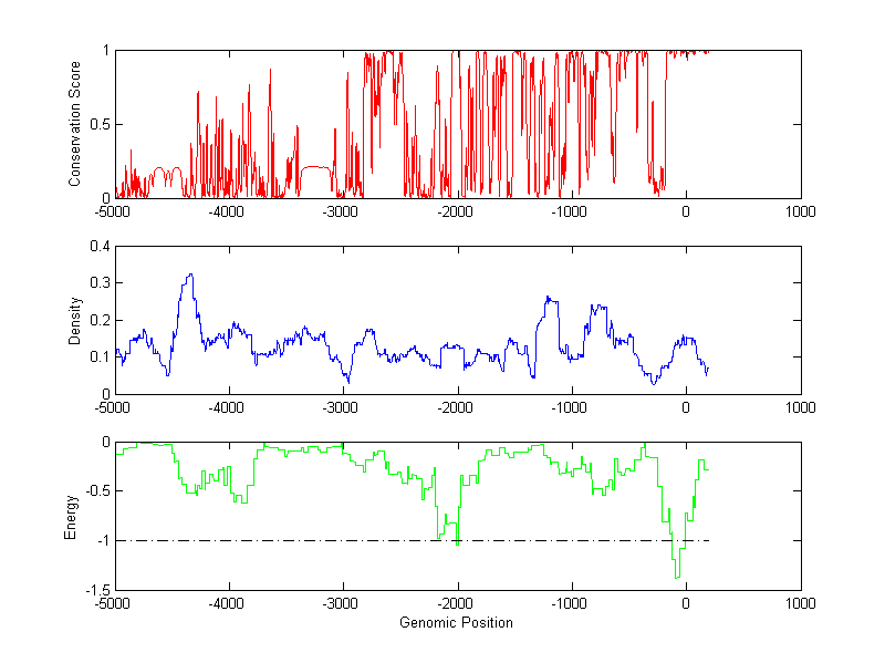About the profiles: The conservation profile (red curve) is about conservation scores of the promoter sequences. Conservation was determined from an eight-way alignment of human, chimpanzee, dog, mouse, rat, chicken, zebrafish and fugu sequences. The conservation was quantified by a conservation score between 0 and 1, with 1 as highest conservation. The conservation score was obtained from UCSC genome databases. The density profile (blue curve) is about density of all TF binding sites. The energy profile (green curve) is about energy for module detection based on TF interaction. The positions with energy less than -1 indicate the existence of CRMs. Download: Conservation profileDensity profile Energy profile CRM summary |