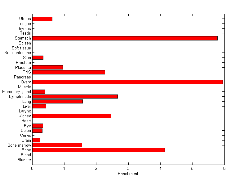 About the profile: The expression level is normalized with tissue-library size. Each value for a gene in a tissue is a ratio of observed ESTs to the expected one in this tissue. The expected number of ESTs is the product of total ESTs of the gene and the fraction of total ESTs in the tissue among all ESTs in 30 tissues. Summary: This gene is preferentially expressed in [ovary, stomach] Download: |