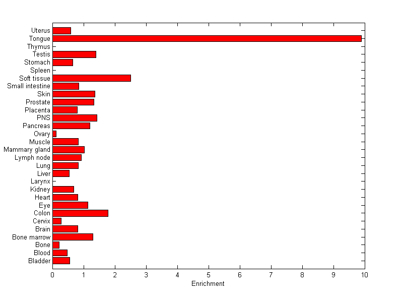 The expression level is normalized with tissue-library size. Each value for a gene in a tissue is a ratio of observed ESTs to the expected one in this tissue. The expected number of ESTs is the product of total ESTs of the gene and the fraction of total ESTs in the tissue among all ESTs in 30 tissues.