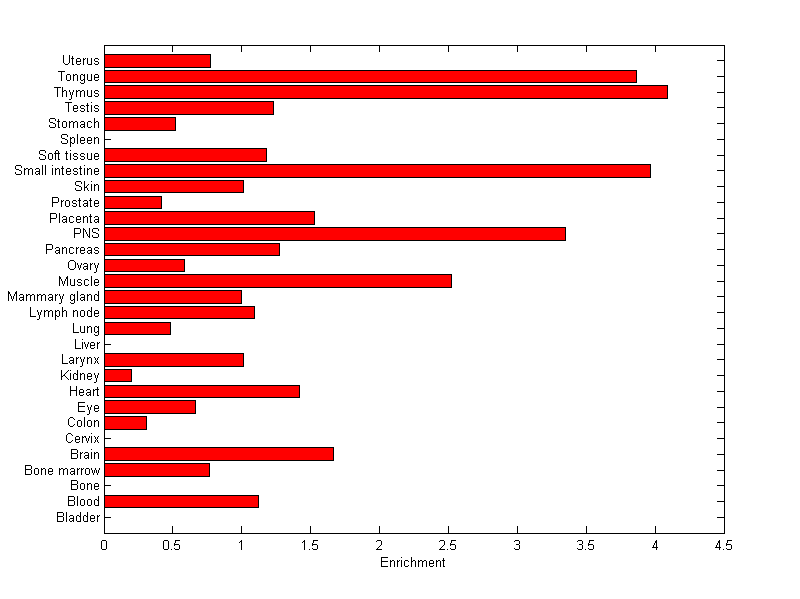 The expression level is normalized with tissue-library size. Each value for a gene in a tissue is a ratio of observed ESTs to the expected one in this tissue. The expected number of ESTs is the product of total ESTs of the gene and the fraction of total ESTs in the tissue among all ESTs in 30 tissues.