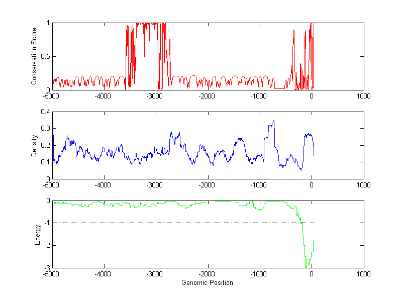 About the profiles: The conservation profile (red curve) is about conservation scores of the promoter sequences. Conservation was determined from an eight-way alignment of human, chimpanzee, dog, mouse, rat, chicken, zebrafish and fugu sequences. The conservation was quantified by a conservation score between 0 and 1, with 1 as highest conservation. The conservation score was obtained from UCSC genome databases. The density profile (blue curve) is about density of all TF binding sites. The energy profile (green curve) is about energy for module detection based on TF interaction. The positions with energy less than -1 indicate the existence of CRMs. Download: Conservation profileDensity profile Energy profile CRM summary |