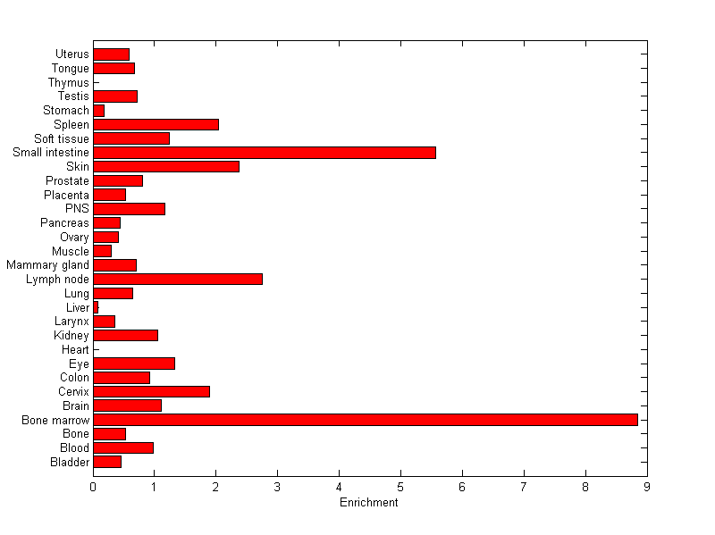 About the profile: The expression level is normalized with tissue-library size. Each value for a gene in a tissue is a ratio of observed ESTs to the expected one in this tissue. The expected number of ESTs is the product of total ESTs of the gene and the fraction of total ESTs in the tissue among all ESTs in 30 tissues. Summary: This gene is preferentially expressed in [bone_marrow, small_intestine] Download: |
