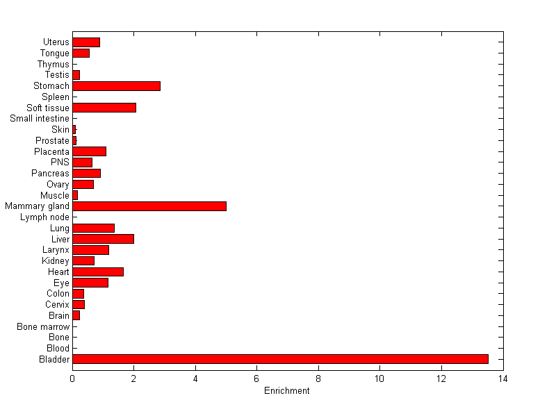 About the profile: The expression level is normalized with tissue-library size. Each value for a gene in a tissue is a ratio of observed ESTs to the expected one in this tissue. The expected number of ESTs is the product of total ESTs of the gene and the fraction of total ESTs in the tissue among all ESTs in 30 tissues. Summary: This gene is preferentially expressed in [bladder, mammary_gland] Download: |