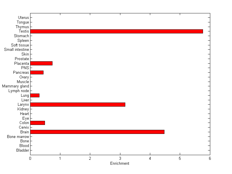The expression level is normalized with tissue-library size. Each value for a gene in a tissue is a ratio of observed ESTs to the expected one in this tissue. The expected number of ESTs is the product of total ESTs of the gene and the fraction of total ESTs in the tissue among all ESTs in 30 tissues.
