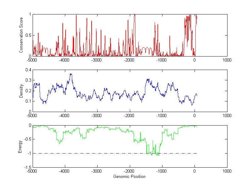 The energy profile (green curve) is about energy for module detection based on TF interaction. The positions with energy less than -1 indicate the existence of CRMs.