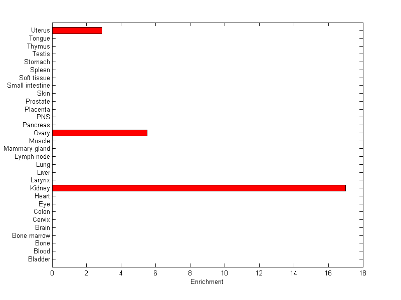 The expression level is normalized with tissue-library size. Each value for a gene in a tissue is a ratio of observed ESTs to the expected one in this tissue. The expected number of ESTs is the product of total ESTs of the gene and the fraction of total ESTs in the tissue among all ESTs in 30 tissues.