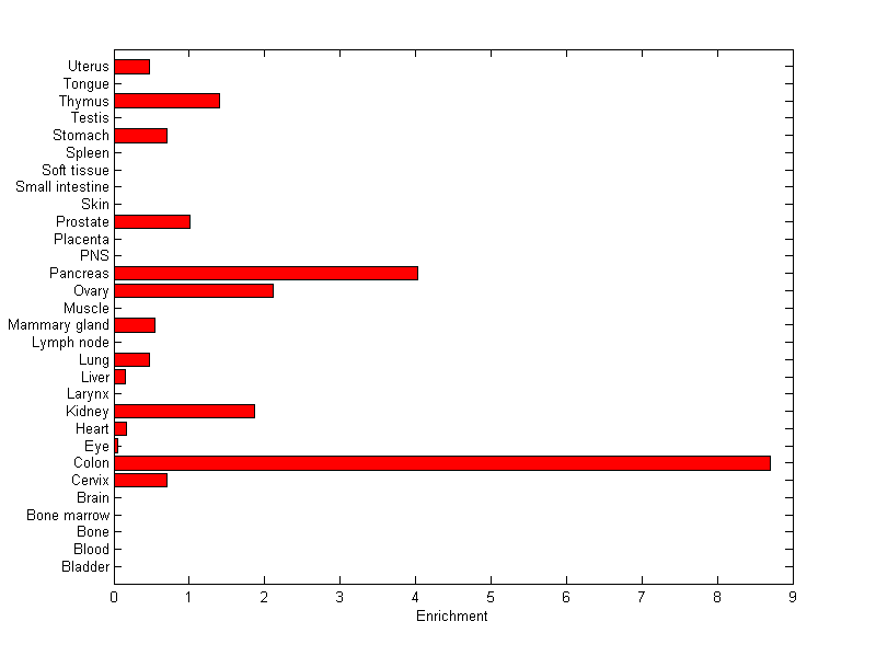 The expression level is normalized with tissue-library size. Each value for a gene in a tissue is a ratio of observed ESTs to the expected one in this tissue. The expected number of ESTs is the product of total ESTs of the gene and the fraction of total ESTs in the tissue among all ESTs in 30 tissues.