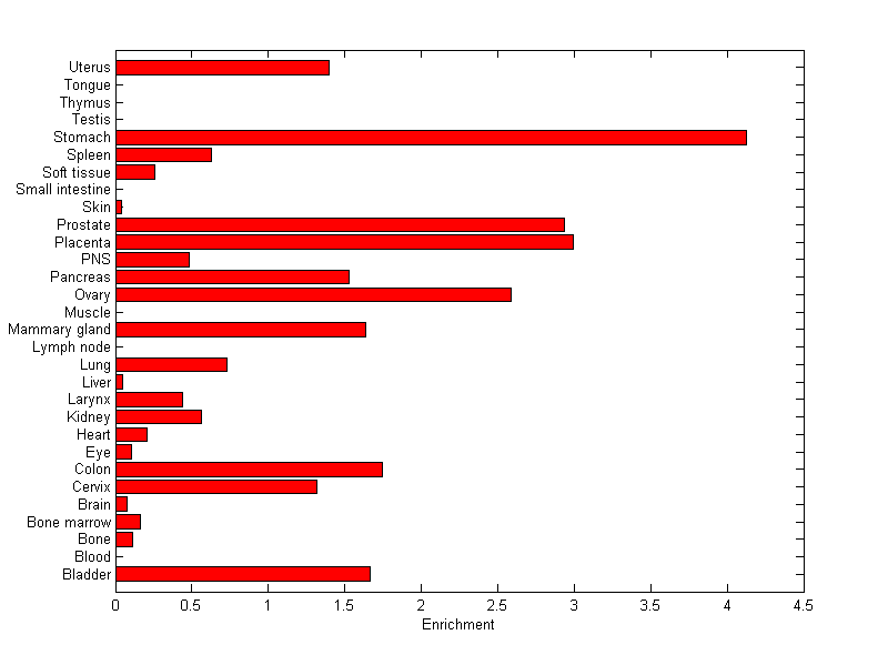 The expression level is normalized with tissue-library size. Each value for a gene in a tissue is a ratio of observed ESTs to the expected one in this tissue. The expected number of ESTs is the product of total ESTs of the gene and the fraction of total ESTs in the tissue among all ESTs in 30 tissues.