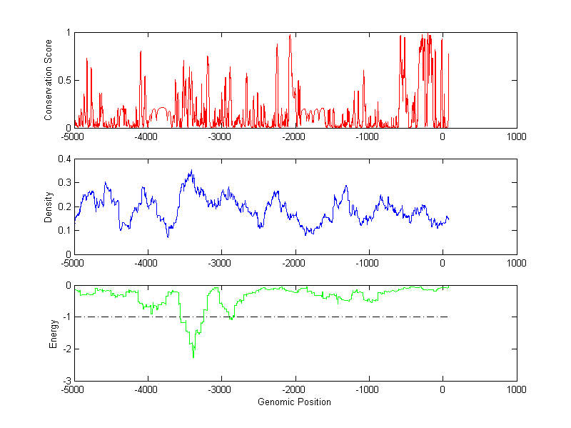 The energy profile (green curve) is about energy for module detection based on TF interaction. The positions with energy less than -1 indicate the existence of CRMs.
