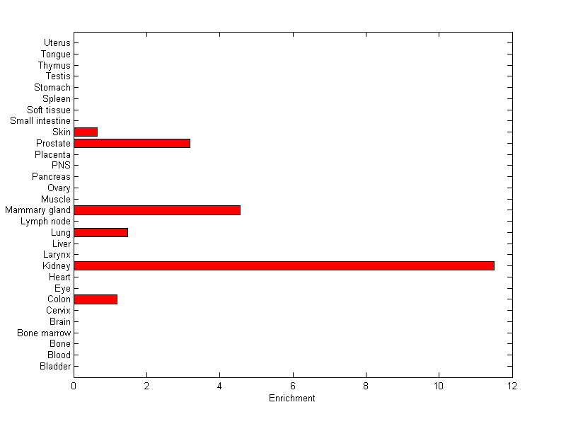 The expression level is normalized with tissue-library size. Each value for a gene in a tissue is a ratio of observed ESTs to the expected one in this tissue. The expected number of ESTs is the product of total ESTs of the gene and the fraction of total ESTs in the tissue among all ESTs in 30 tissues.