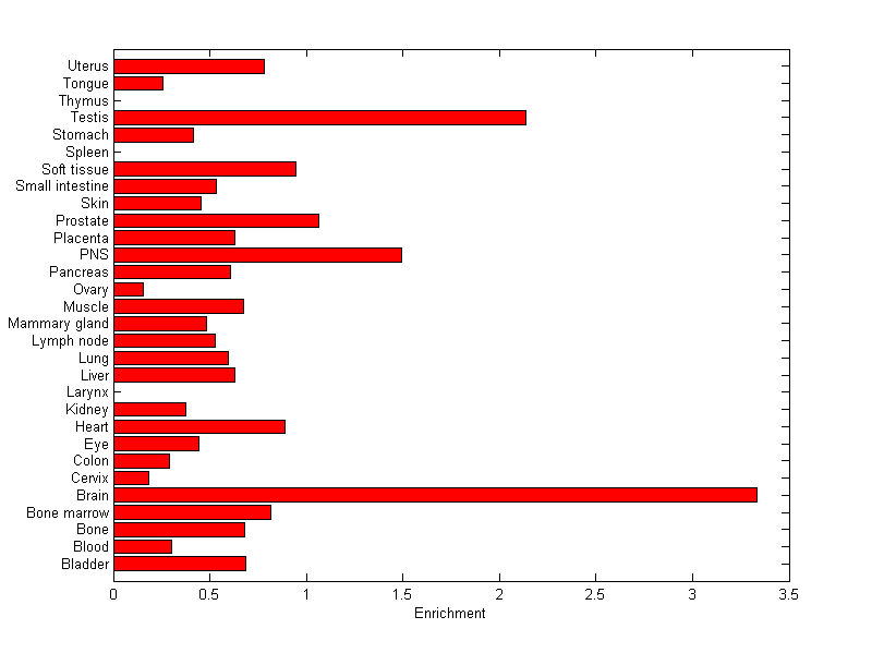 The expression level is normalized with tissue-library size. Each value for a gene in a tissue is a ratio of observed ESTs to the expected one in this tissue. The expected number of ESTs is the product of total ESTs of the gene and the fraction of total ESTs in the tissue among all ESTs in 30 tissues.