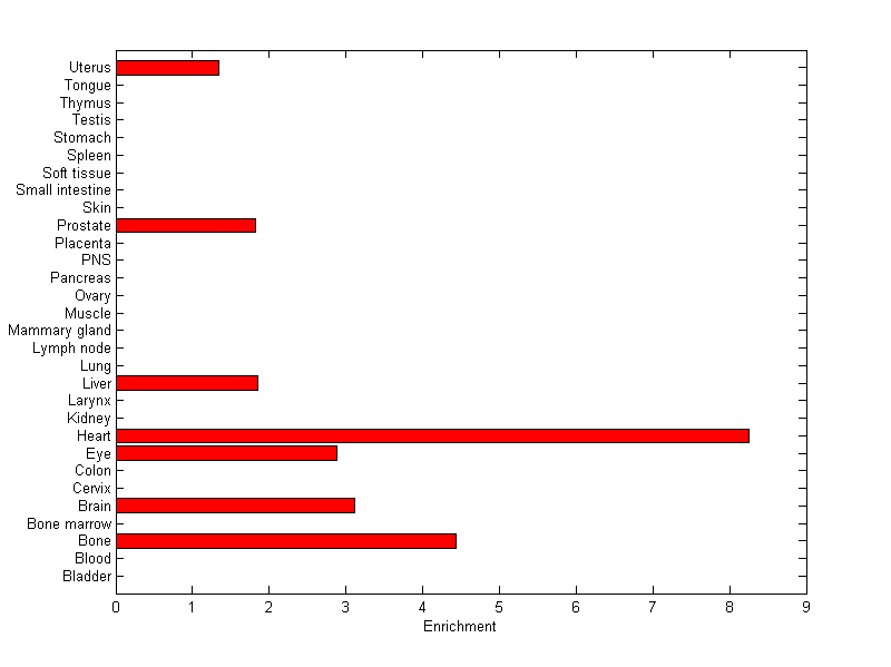 The expression level is normalized with tissue-library size. Each value for a gene in a tissue is a ratio of observed ESTs to the expected one in this tissue. The expected number of ESTs is the product of total ESTs of the gene and the fraction of total ESTs in the tissue among all ESTs in 30 tissues.