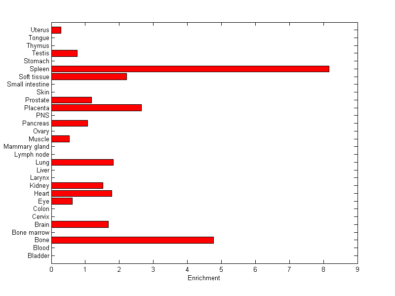 The expression level is normalized with tissue-library size. Each value for a gene in a tissue is a ratio of observed ESTs to the expected one in this tissue. The expected number of ESTs is the product of total ESTs of the gene and the fraction of total ESTs in the tissue among all ESTs in 30 tissues.