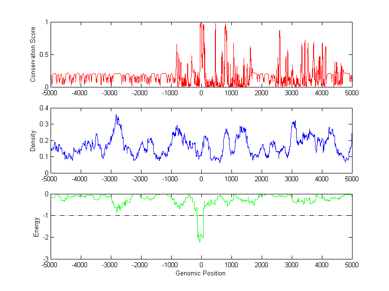 The energy profile (green curve) is about energy for module detection based on TF interaction. The positions with energy less than -1 indicate the existence of CRMs.