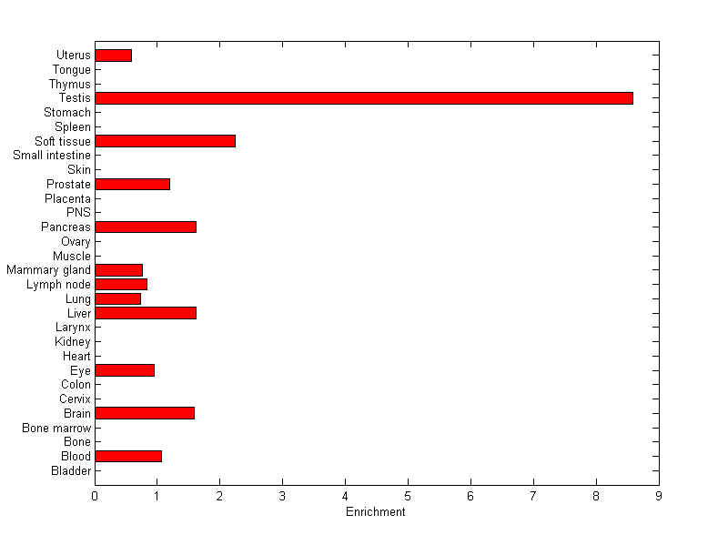 The expression level is normalized with tissue-library size. Each value for a gene in a tissue is a ratio of observed ESTs to the expected one in this tissue. The expected number of ESTs is the product of total ESTs of the gene and the fraction of total ESTs in the tissue among all ESTs in 30 tissues.