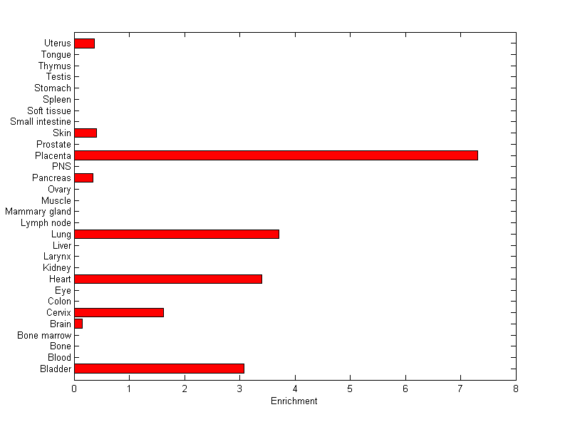 The expression level is normalized with tissue-library size. Each value for a gene in a tissue is a ratio of observed ESTs to the expected one in this tissue. The expected number of ESTs is the product of total ESTs of the gene and the fraction of total ESTs in the tissue among all ESTs in 30 tissues.
