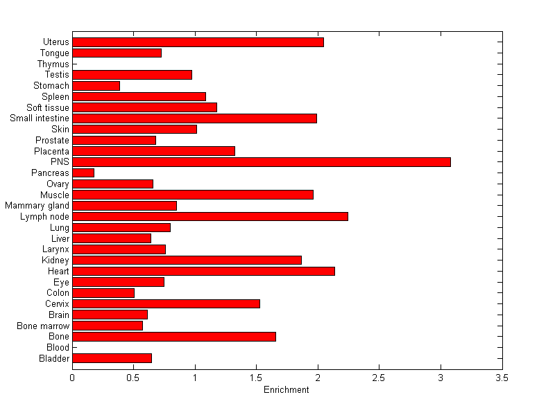 The expression level is normalized with tissue-library size. Each value for a gene in a tissue is a ratio of observed ESTs to the expected one in this tissue. The expected number of ESTs is the product of total ESTs of the gene and the fraction of total ESTs in the tissue among all ESTs in 30 tissues.