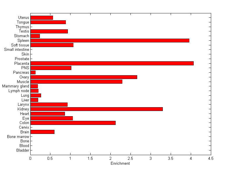 The expression level is normalized with tissue-library size. Each value for a gene in a tissue is a ratio of observed ESTs to the expected one in this tissue. The expected number of ESTs is the product of total ESTs of the gene and the fraction of total ESTs in the tissue among all ESTs in 30 tissues.