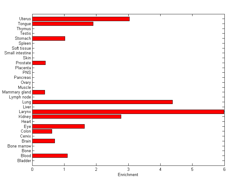 The expression level is normalized with tissue-library size. Each value for a gene in a tissue is a ratio of observed ESTs to the expected one in this tissue. The expected number of ESTs is the product of total ESTs of the gene and the fraction of total ESTs in the tissue among all ESTs in 30 tissues.