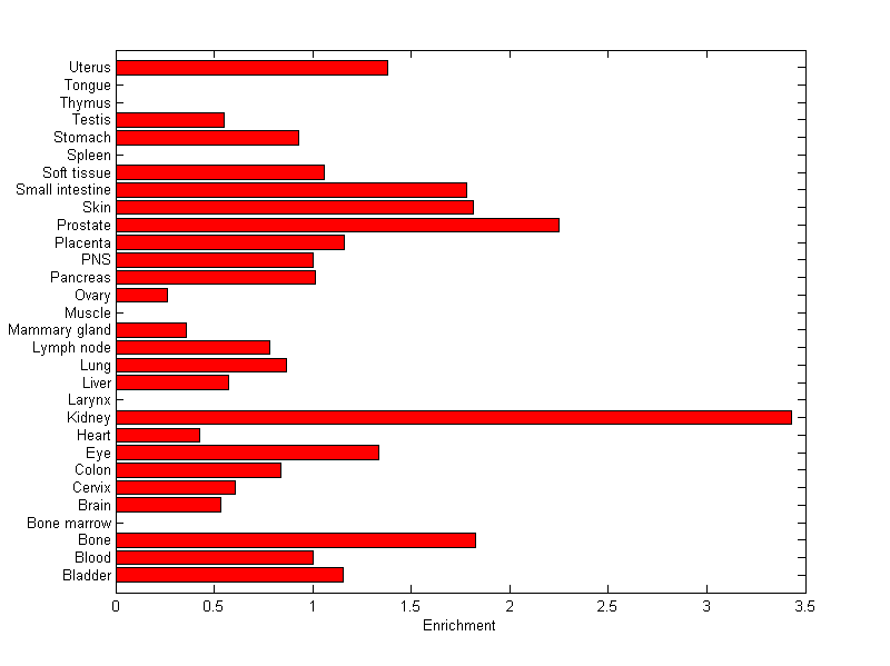 The expression level is normalized with tissue-library size. Each value for a gene in a tissue is a ratio of observed ESTs to the expected one in this tissue. The expected number of ESTs is the product of total ESTs of the gene and the fraction of total ESTs in the tissue among all ESTs in 30 tissues.