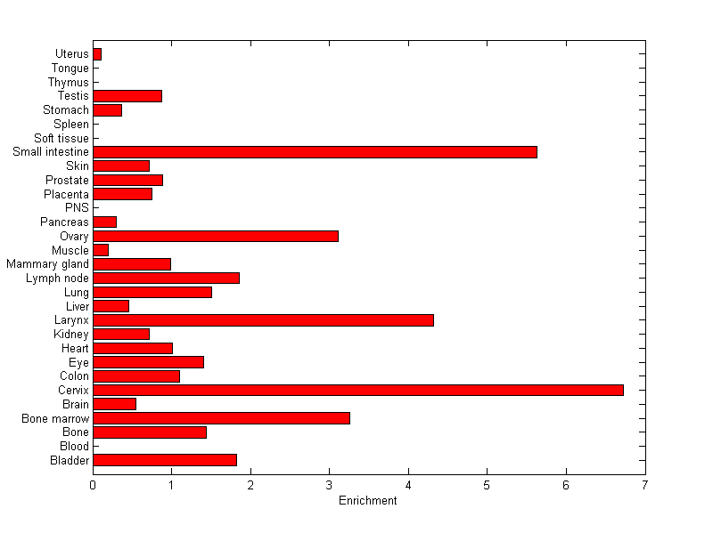 The expression level is normalized with tissue-library size. Each value for a gene in a tissue is a ratio of observed ESTs to the expected one in this tissue. The expected number of ESTs is the product of total ESTs of the gene and the fraction of total ESTs in the tissue among all ESTs in 30 tissues.