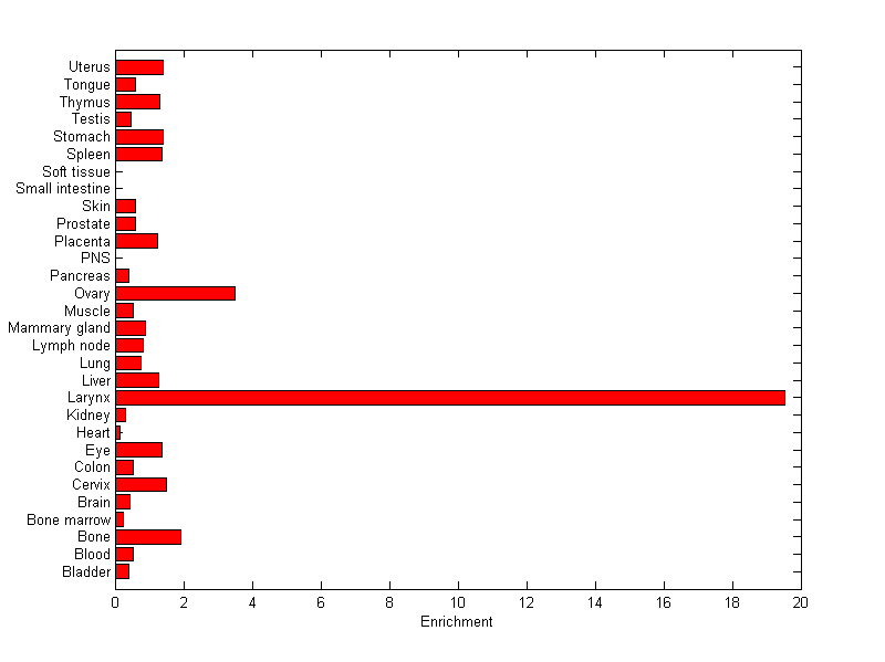 The expression level is normalized with tissue-library size. Each value for a gene in a tissue is a ratio of observed ESTs to the expected one in this tissue. The expected number of ESTs is the product of total ESTs of the gene and the fraction of total ESTs in the tissue among all ESTs in 30 tissues.