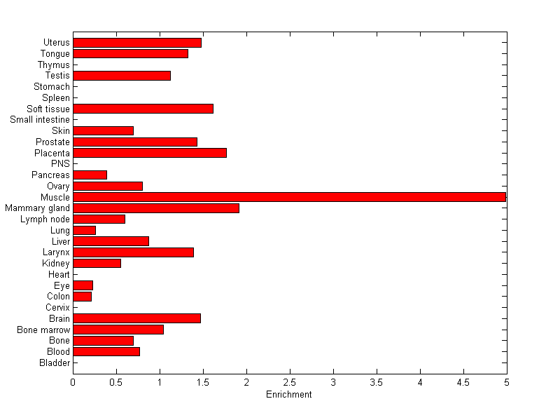 The expression level is normalized with tissue-library size. Each value for a gene in a tissue is a ratio of observed ESTs to the expected one in this tissue. The expected number of ESTs is the product of total ESTs of the gene and the fraction of total ESTs in the tissue among all ESTs in 30 tissues.