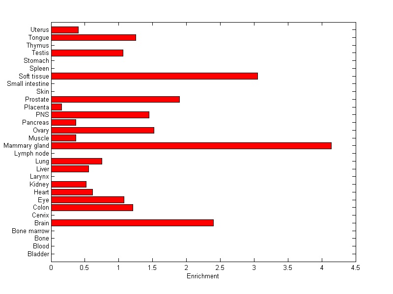 The expression level is normalized with tissue-library size. Each value for a gene in a tissue is a ratio of observed ESTs to the expected one in this tissue. The expected number of ESTs is the product of total ESTs of the gene and the fraction of total ESTs in the tissue among all ESTs in 30 tissues.